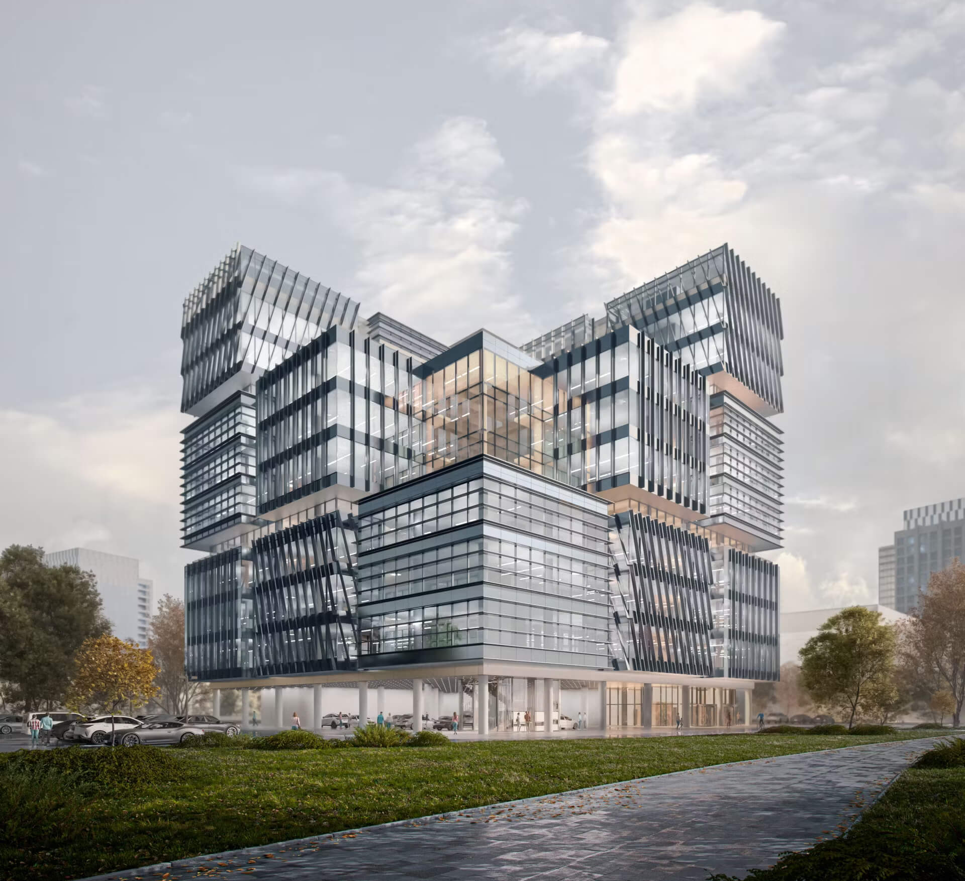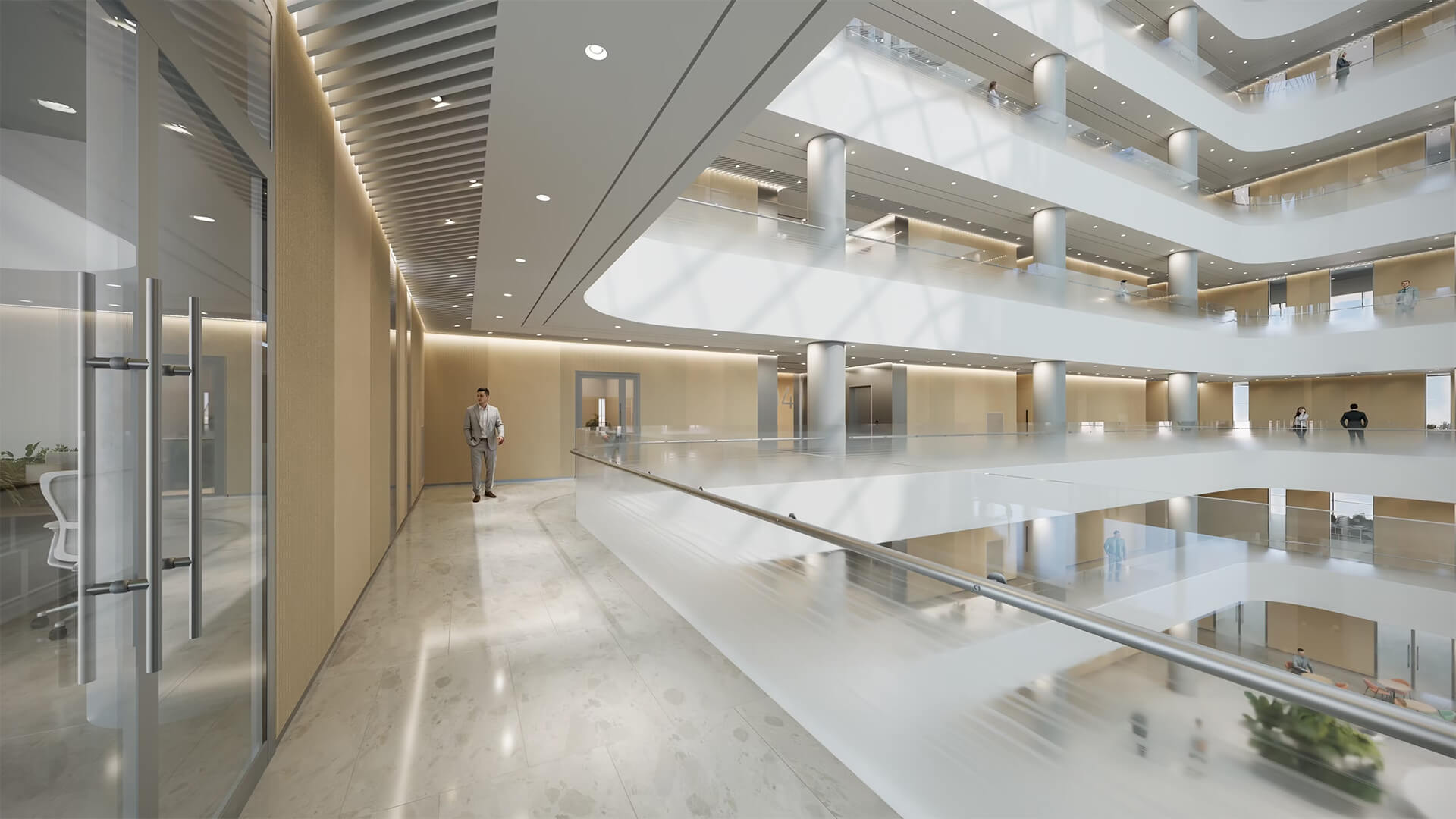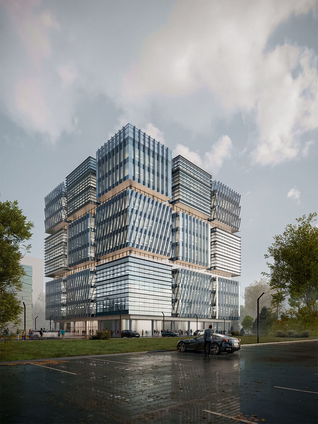Архитектурное решение выполнено в виде 23 объемов кубической формы, объединенных в цельный монолитный ансамбль. Центральный атриум со светопрозрачным куполом наполняет здание естественным светом, а на этажах предусмотрены террасы и балконы, создающие комфортные зоны отдыха. Высота потолков достигает 4,3 м, что усиливает ощущение пространства и свободы.