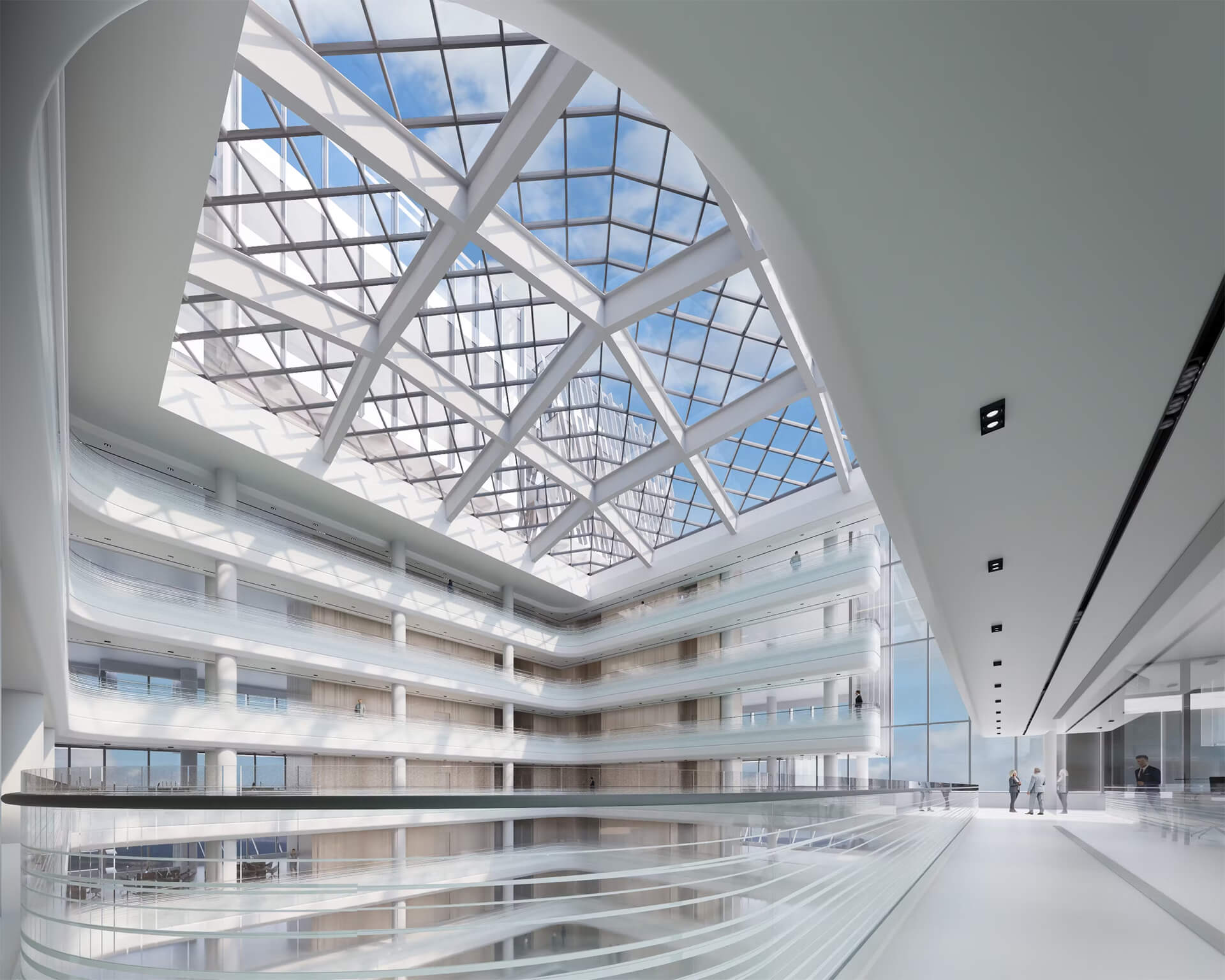 В центре здания расположен просторный атриум со стеклянным куполом, который служит естественным источником света и придает внутреннему пространству ощущение открытости. Эксплуатируемые кровли и террасы на 5-м и 9-м этажах создают дополнительные площадки для отдыха и неформальных встреч.
